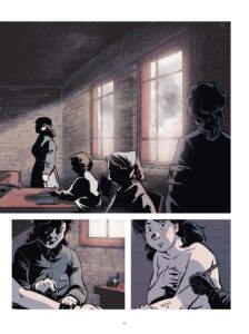 Igual, o más destacable incluso, es el trabajo de los ilustradores, que han sabido componer la estructura narrativa para mezclar y alternar el pasado con el presente, pudiendo apreciar los contrastes entre la protagonista. Así mismo, considero que es un gran recurso el uso de las sombras deshumanizadas como personas que vivieron los acontecimientos. Este recurso se puede interpretar de múltiples maneras, dejando la responsabilidad de ello al lector.