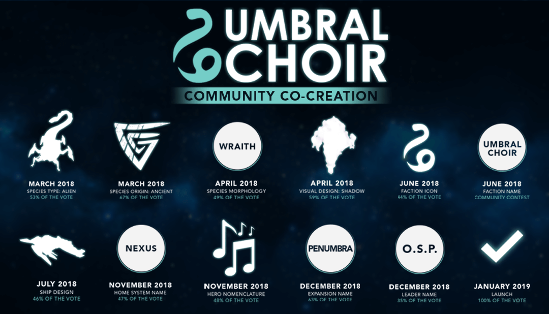 Hace 10 meses, comenzamos un viaje para cocrear la facción Umbral Choir con nuestra comunidad. Tuvimos una serie de votos sobre todo, desde el orig en de las especies, la morfología, la nomenclatura, la estructura de la nave, el saber y mucho más… Esta serie de 11 votos de la comunidad nos ayudó a crear la facción espectral a la que hemos llegado hoy, que no se parece en nada a las facciones que hemos creado antes. ¡Gracias a todos los que contribuyeron!