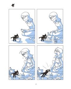 En cada página podremos ver una nueva situación (o aventura si es desde el punto de vista del felino) de esta nueva vida en común y deleitarnos con el dibujo sencillo, pero totalmente claro de Jean-Luc Deglin. Las formas y los fondos son simples, pero recrean de forma exacta lo que necesita cada historieta para entenderla y verse reflejada en las propias vivencias de novata dueña del gato Cafre.