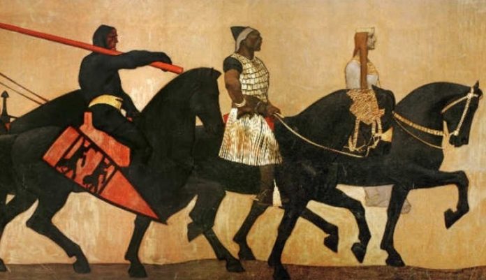 Fue uno de los guerreros a donde yacía un muerto Se arrodilló ante su herida, se deshebilló su yelmo y empezó a beber entonces la sangre que chorreaba Por muy extraño que fuese, estimó que estaba buena
