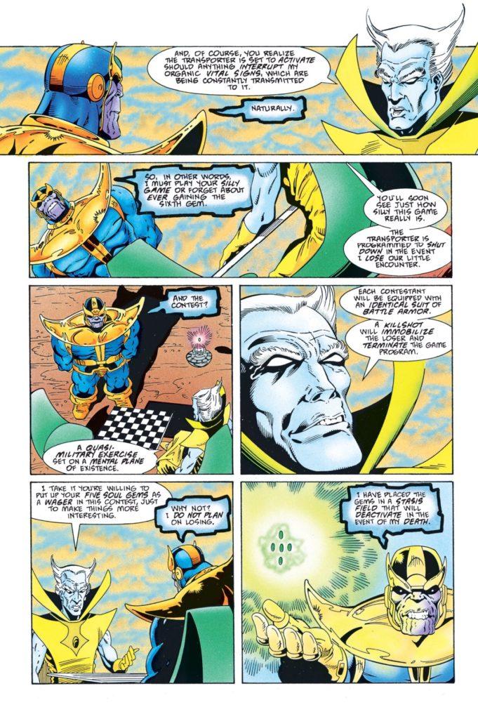 Starlin narraría un nuevo intento de Thanos por alcanzar la divinidad y ser digno de su amada Muerte. En esta ocasión para conseguir su propósito volvería a hacer uso de las Gemas del Infinito. Para ello necesitaba librarse de Estela Plateada, alguien que podía hacer naufragar su plan. Además tendría que vérselas con los Arcanos o Primigenios del Universo, los poseedores actuales de dichas gemas. Se trata de unos personajes muy antiguos así como únicos en su raza (lo que en cierto modo los hermana), al tiempo que entidades muy poderosas e inteligentes, dedicados por completo a una única tarea, obsesión podríamos decir, en su vida. La inteligencia y táctica con la que el Titán Loco se enfrenta a ellos, uno a uno, consiguiendo una gema cada vez, nos ofrece una visión magnifica de Thanos, de estratega inteligente. Pero como siempre con el personaje hay algo con lo que no cuenta: una vez Thanos consiga la omnisciencia, ¿podrá amarle la Muerte como amaría a un igual? ¿O debería temerle y respetarle? ¿Llegaría a conspirar contra él?