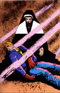 Pero donde realmente destaca como ningún otro, es en las viñetas donde Matt Murdock es asistido por una monja. Las composiciones de esas ilustraciones recuerdan los cuadros religiosos que evocan escenas de la biblia como el cuadro de La Piedad, de Goya.