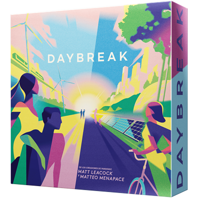 se»Daybreak es un juego en el que construirás las más alucinantes tecnologías y moldearás sociedades para que puedan resistir a un planeta que se sobrecalienta. Durante la partida jugarás cartas en pilas, prepararás poderosas combinaciones y elaborarás estrategias junto con tu grupo de juego para lograr descarbonizar la sociedad».