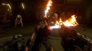 Hablando de las mismas, una de las mejores sensaciones en el control es el del disparo. Una muy buena precisión y un modelado de gran nivel de las armas hace que acertar a los enemigos desde lejos sea relativamente fácil y muy divertido. A bocajarro, sin embargo, es donde nos encontramos un problema serio: hay cierto tipo de enemigos, como los Imps, que tienden a hacerte daño de meleé. Se colocan tan cerca, que dejas de verlos porque parece que están en tu misma posición. Te atraviesan, la colisión de personaje es demasiado pequeña. Lo peor es que, en esta situación, ni siquiera puedes dispararles bien porque el arma atraviesa al enemigo, disparando detrás suyo. Hay que maniobrar para alejarse un poco o utilizar el golpe de energía, que por eso lo habrán puesto. Otra razón más para que acabemos disparando desde lo más lejos posible.