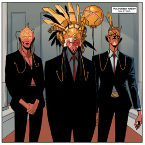 Con una ambientación parecida a Marte y unos pilares de piedra en una base de metal, Hickman nos introduce su historia con un ‘El sueño se ha acabado’ y tres de los Cuatro Jinetes del Apocalipsis, cada uno de ellos de un color.