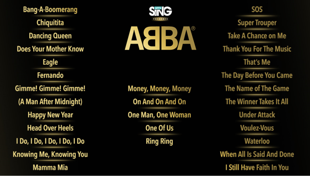 Conviértete en una Dancing Queen o en un Super Trouper en Summer Night City o celebra el Nuevo Año con Happy New Year. O, si eso es más lo tuyo, mira lo que ocurrió en Waterloo. Puedes jugar solo o coger a algunos amigos para empezar tu fiesta de karaoke. Cuando todo esté dicho y hecho, nos gustaría daros las gracias por la música y esperamos que disfrutéis de la experiencia que supone Let’s Sing Presents ABBA.