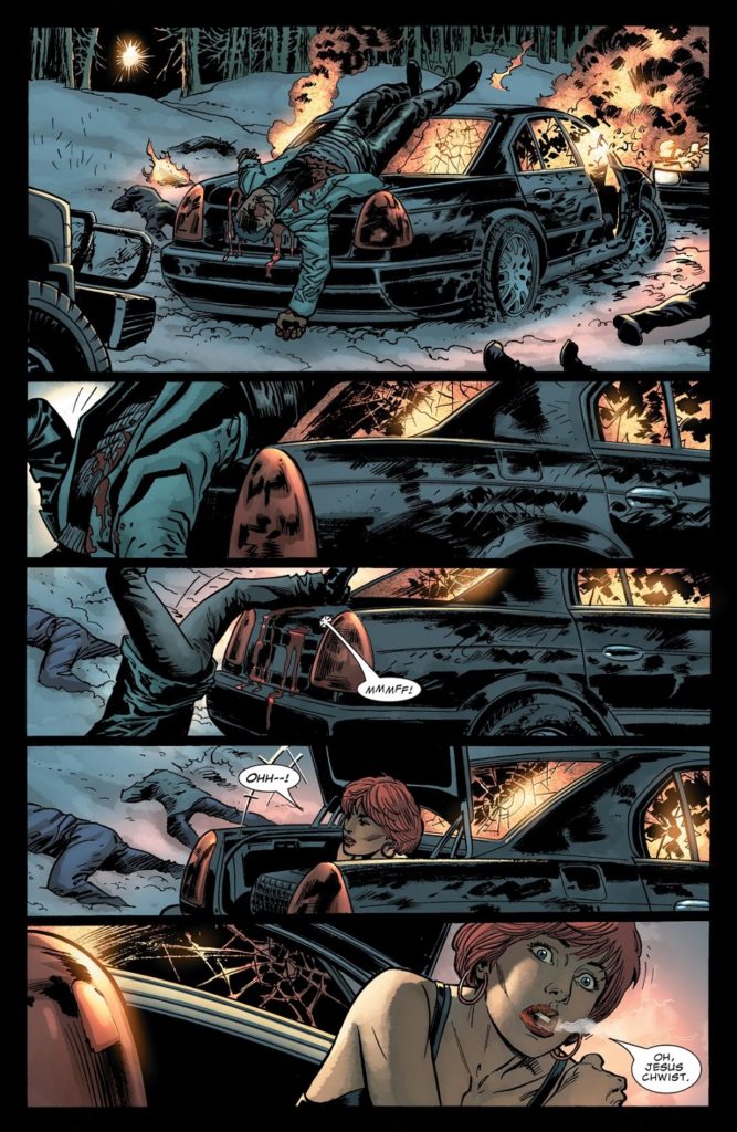 A partir de aquí la trama entra en su recta final. Paul Budiansky quizás pueda acabar pareciéndose más al Castigador, por ciertos hechos que ocurren. J se parece ya a Frank, por ciertos hechos ocurridos hace tiempo. Y cuando Frank deba quedarse en cama lamiéndose las heridas y sea J quien pueda llevar a cabo su venganza, cuando las Viudas, ya desquiciadas, intentando salvar su culo a cualquier precio, reciban su merecido, cuando eso ocurra… ¿nos seguirán pareciendo lícitos los métodos de venganza empleados o quizás, pese a que se los merezcan, nos estremezcamos? Resulta curioso, cuanto menos, que Ennis decida poner la Negan-escena no en manos del propio Frank, sino de J, y es que aunque justificada, impresiona. Parece que haya querido salvar a su personaje, darle más humanidad, aunque sea por contraste.