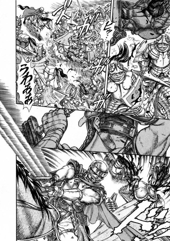 Tres años después de la incorporación de Guts, a la Banda del Halcón se la conoce como “los ángeles de la muerte del campo de batalla” y el otrora solitario guerrero está al mando de 500 hombres como Jefe del Pelotón de Asalto. Así que los Demonios Negros de Tudor se las prometían muy felices diezmando a las tropas del Rey de Midland hasta que el espadón de Guts entra en escena, obligando a los orgullosos Caballeros Acorazados de la Oveja Negra con Lanza de Hierro a batirse en retirada.