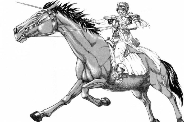 En “Ráfaga de espada” Kentarō Miura hace dos cosas que le encantan: dar un salto adelante de tres años y lucirse con el lápiz en una batalla multitudinaria con un diseño de armaduras espectacular. Impresiona.