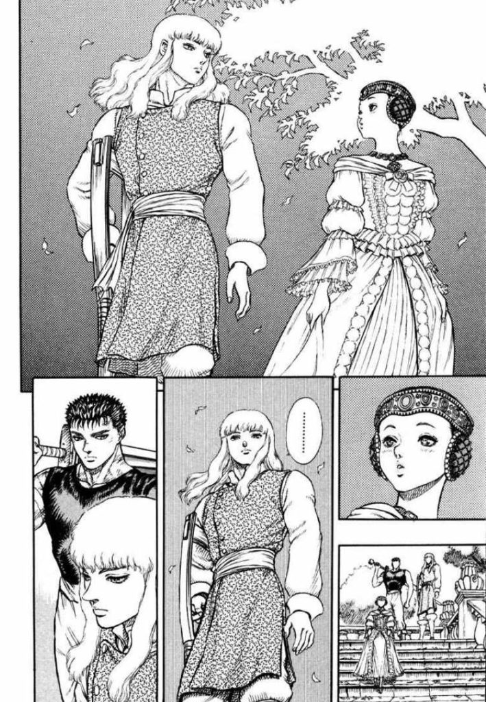 En “El dueño de la espada” y “El asesino” la relación entre Guts y Griffith gana en profundidad al tiempo que este último deja ver sus intenciones en una conversación con la princesa Charlotte, que acaba convertida en un monólogo digno de ser leído con atención. También está muy presente en estas páginas Kasca, la capitana de la banda, cuya antipatía por Guts mengua preparando el terreno para el siguiente arco, en el que Kentarō Miura presenta a la única miembro femenina de la Banda del Halcón y del que hablaremos en detalle en la reseña del tomo 4 de Maximum Berserk.
