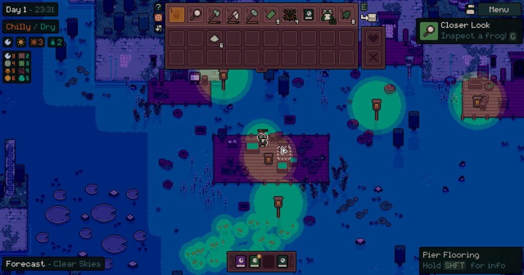 Para esto, nos harán falta recursos que evidentemente se obtendrán explorando y a través de diferentes mecánicas, las cuales por suerte rompen el ciclo de exploración-recolección de recursos y hacen que jugar Mudborne sea algo más que un simple life-sim.