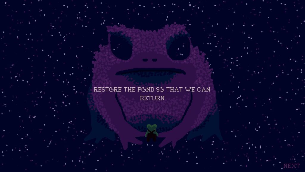 Despiertas tras un tiempo en letargo, y descubres que tu estanque se ha vaciado. Tu misión consistirá en restaurar tu hábitat y descubrir nuevas especies de ranitas.