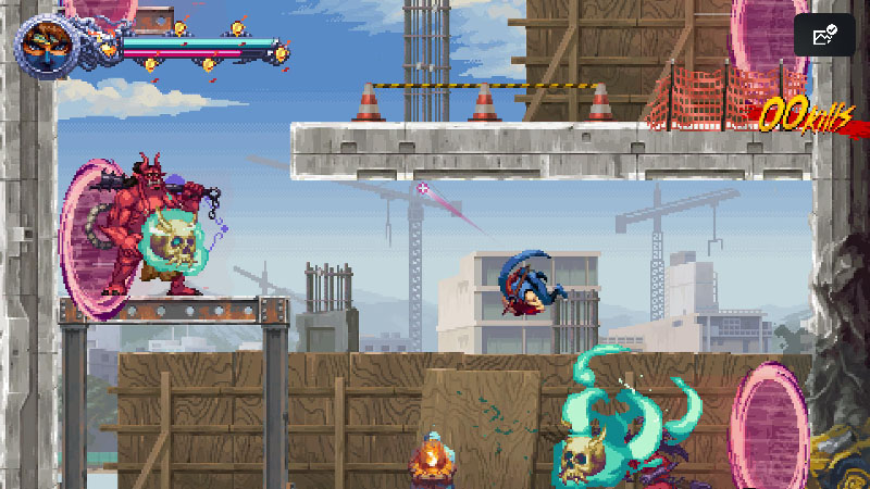 Podemos considerar Ragebound un spin-off. Aunque el bueno de Ryu Hayabusa aparece en los primeros minutos de juego, en realidad controlaremos a dos personajes. Kenji, uno de los discípulos de Ryu, un ninja centrado en el combate cuerpo a cuerpo Por otro lado, Kumori, una kunoichi miembro de del clan de la araña, es experta en el combate a distancia con sus kunais. Ambos deberán unir fuerzas para enfrentarse a los demonios en esta extraña alianza entre clanes rivales. Juntos nos llevarán por un buen puñado de niveles que nos darán todo lo que esperamos de este título: Plataformas desafiantes, enemigos que cortar por la mitad, poderosos jefes, y alguna que otra fase especial para refrescar la jugabilidad. Aunque Kenji está más enfocado al ataque cuerpo a cuerpo y Kumori ataca a distancia, ambos cuentan con mecánicas idénticas. Por un lado, podemos “rebotar” sobre los enemigos y otros elementos del escenario utilizando el Impulso de Guillotina, de una forma similar a lo que hace Hollow Knight cuando ataca hacia abajo en un salto. Por otro lado, tenemos la Hipercarga, un poderoso ataque que podremos realizar consiguiendo “aura” que obtendremos de enemigos brillantes. con la Hipercarga podremos cortar tanto enemigos grandes como obstáculos de un solo tajo. Con esto y un diseño de niveles excelente, que brinda un plataformeo complicado pero no por ello frustrante, y un ritmo de combates ágil, el resultado que da son unas mecánicas jugables sólidas y muy divertidas.