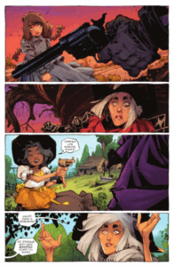 Antes de entrar en más profundidad, quiero destacar que No hay tumba es un cómic diferente. Muestra una historia dura y muy interesante. Pero lo que más destaca es la cantidad de viñetas sin un sólo diálogo ni descripción. En este punto creo que lo que el equipo artístico ha pretendido es contar una historia difícil dando un gran protagonismo al dibujo. Skottie Young realiza la función de guionista en esta obra, pero también destaca por ser un grandísimo ilustrador. Y creo que eso le ha llevado a desarrollar una historia centrada en un largo viaje, donde solo el silencio acompaña a los increíbles dibujos de Jorge Corona, permitiendo así lucir todo su potencial.