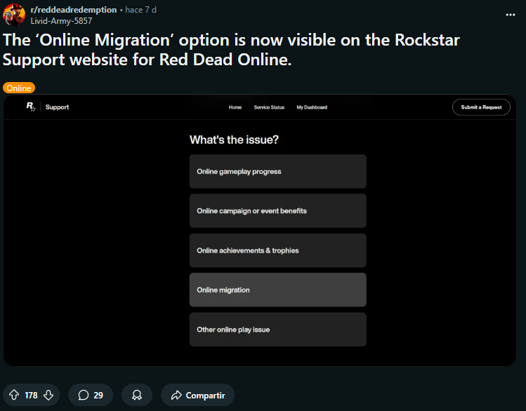 El origen del rumor de una posible versión mejorada de Red Dead Redemption para Nintendo Switch 2, Play Station 5 y Xbox Series reside en una misteriosa opción de «migración online» que apareció en la web de sorporte del videojuego. Esta elección, que fue retirada al poco de haber aparecido, ha despertado los rumores en la comunidad de jugadores.