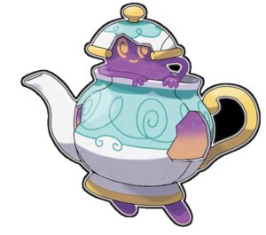 Polteageist – El fantasma de la tetera —cuyo nombre es un juego de palabras— es un Pokémon fantasma que al esconderse en las piezas de los hoteles comúnmente, se le ve como si fuera una suerte de peste.