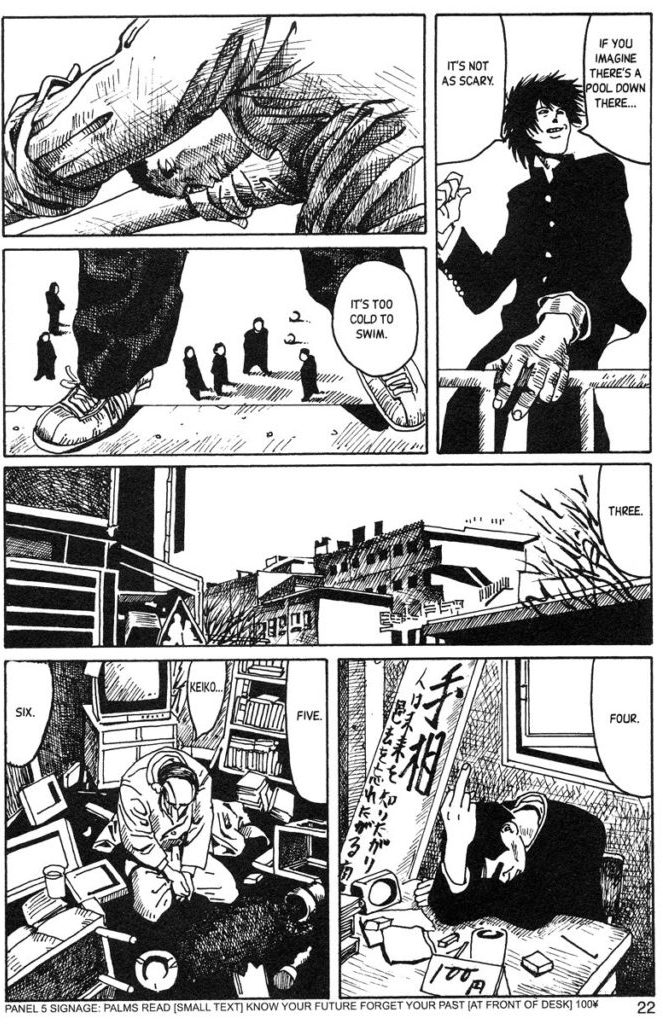 Otra cara de la violencia la encontramos en «Paz», que nos muestra la delgada línea que separa crecer sin expectativas ni asideros morales de la violencia gratuita. En «¡Los restaurantes familiares son nuestro paraíso!», el autor nos da un respiro para que acompañemos a un grupo de chavales en su sobremesa en el restaurante Donny’s: abierto 365 días al año. Si buscas un sitio tranquilo para llenar el buche quizá no sea la mejor opción, pero si disfrutas del ambiente “familiar”, las parejas en plena reconciliación y los amigos que discuten por la cuenta, es tu local. Tras las dos historias anteriores acerca de la peligrosa deriva de la juventud sin futuro, este capítulo nos reconcilia con esos momentos que pasamos haraganeando con nuestros amigos, sin perder el toque único y controladamente alocado de Matsumoto. Precisamente esta mezcla frenética de varias historias en un mismo espacio me ha recordado al relato «Caos en las aulas» incluido en Bajo un cielo con un pantis 1, que presenta una delirante jornada en un instituto repleto de estudiantes que también se las traen.