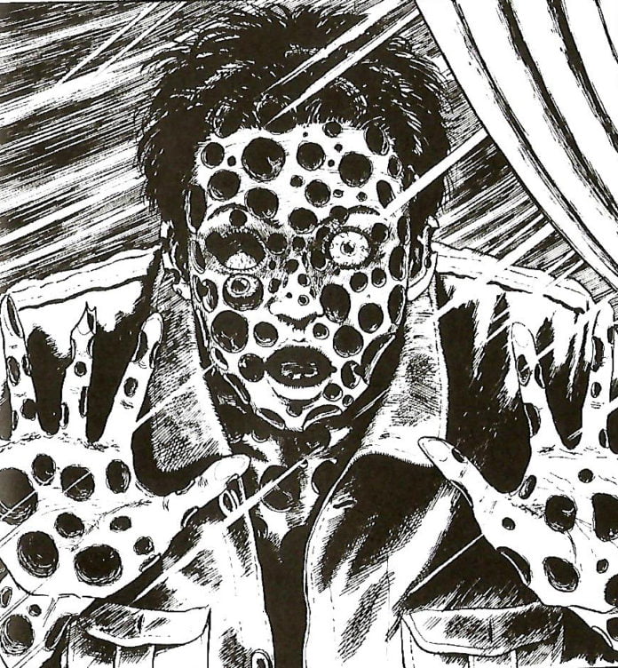 El tomo gana algunos puntos con “Escalofríos”, que como su mismo nombre indica, no es un relato que disfrutarás (¡vaya, justo lo que espero de este género!), especialmente si tienes tripofobia (miedo o incomodidad al ver grupos de agujeros) a cualquier nivel. Aquí, un chico llamado Yûji descubre que la enfermedad de su vecina, que le causa agujeros en el cuerpo, y la muerte de su abuelo están relacionadas por una misteriosa talla de un insecto de jade. Lo explícito de las imágenes y el elemento sobrenatural te hacen esperar una auténtica obra de arte… pero otra vez llega un final sin sentido que hace trizas todo el horror construido en la historia. No obstante, el mal cuerpo que te deja “Escalofríos” sabe al mejor Junji Ito y hace que merezca la pena darle una oportunidad a este relato.