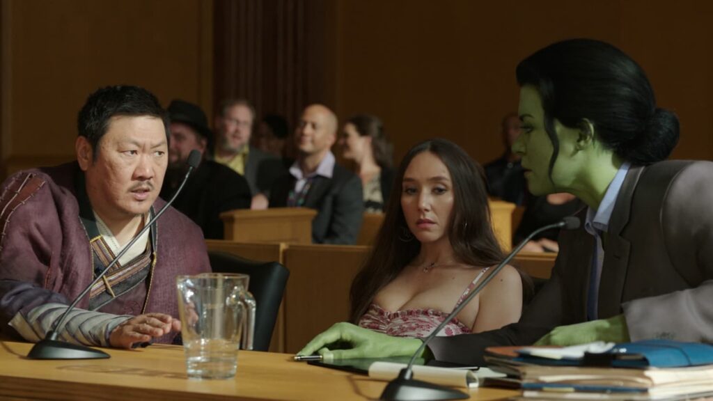 Hay algo más que hace de «She-Hulk: Abogada Hulka» una serie diferente dentro del UCM: es muy meta. Mucho. Desde los guiños cómicos del guion a las rupturas constantes de la cuarta pared de Jen y, por supuesto, los villanos. Los malvados antagonistas que odian a Hulka son un grupo de hombres misóginos sacados directamente de los rincones más tóxicos del fandom. Basta con darse una vuelta por internet para encontrarse con ellos. Están por todas partes, sujetando los frágiles trocitos de su masculinidad con cinta adhesiva y clamando al cielo para que las mujeres no sean más que un interés amoroso con ropa ajustada. Son tan previsibles que los guionistas de “She-Hulk” pudieron incorporarlos perfectamente en el entramado de la serie. Habría sido una jugada maestra de no ser porque son unos villanos bastante patéticos y anodinos. Tan realistas que aburren.