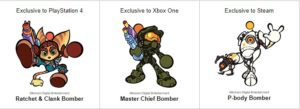 Así, los que compren el juego en Playstation 4 recibirán a Ratchet & Clank Bomber, un sin de Ratchet para Bomberman básicamente. Aquellos que lo compren en Xbox One recibirán a Master Chief Bomber, inspirado en el jefe maestro y, por último, aquellos que lo hagan en PC serán obsequiados con P-body Bomber, basado en el personaje de Portal 2.
