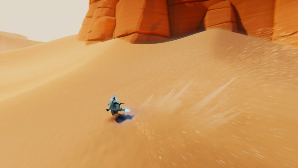 Precisamente, el emplear este método tan peculiar de transporte es lo que aporta una sello de identidad a Sword of the Sea, pues el desplazamiento se percibe muy fluido y dinámico, llegando a resultar incluso satisfactorio. Además, si eliges jugar a este juego en PlayStation 5, la experiencia mejora todavía más gracias al altavoz del Sony DualSense, por donde escucharás el fluir del agua y el discurrir de la arena.