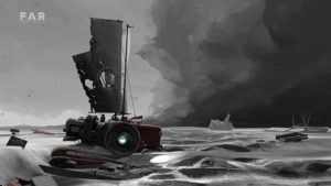 FAR: Lone Sails se aleja de todo ello. Es la versión en juego de sentarse en una roca a ver el atardecer en silencio. Con poco más que uno y sus pensamientos y no solo en su sistema de juego. Todo el aspecto visual, atractivo sin lugar a dudas gracias a su limpieza y la selección de la gama de color, mayoritariamente en escala de grises salvo algunos elementos seleccionados, sigue a pies juntillas esta idea.