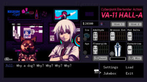 Entrando en el tema técnico, hay que recordar que VA-11 Hall-A es un título creado prácticamente por dos personas (más un compositor). En lo visual, utiliza una estética pixel que imita las novelas visuales de antaño. Aunque no cuenta con una gran cantidad de escenarios, están bien recreados, y nos dan información de cómo es el mundo que rodea a Jill y compañía. Quizás el mejor trabajo sea el de los personajes, cuyos diseños son bastante llamativos y cuentan con pequeñas animaciones. Por otro lado, la banda sonora, que corre a cargo de Michael «Garoad» Kelly, es de esas que en un principio te parecen normalitas pero poco a poco te van gustando, hasta que descubres que cuenta con auténticos temazos muy pegadizos que encajan estupendamente con la estética del juego.